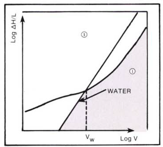 Regions 2 and 3 are separated by the frictional loss curve for water, which is a straight line with a slope approximately equal to 2.